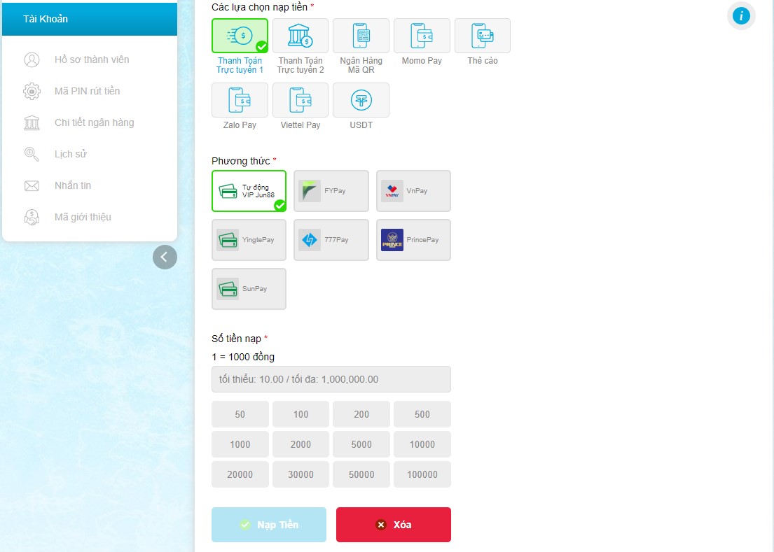 - Jun88 quy định số tiền nạp tối thiểu là 10.000 đồng và tối đa là 40 triệu đồng.